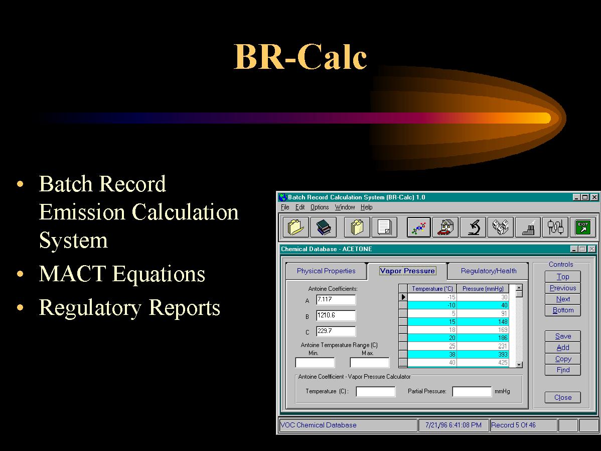 · Import / Export of batch products · No limit on the number of batch products used in the system · No limit on the number of Campaigns that can be run for a product · No limit on the number of steps a batch can have · No limit on the number of control devices on a specific piece of equipment · No limit on the number of chemicals that can be added in a step · Control devices use calculated, default or user defined efficiencies · A Reorder function to rearrange the steps on a batch record if necessary · Numerous Copy functions at the product and step level to make data entry easier · Program security access levels based on logon user ID’s for superuser, read / write access and read only access · Built in data backup / restore feature for historical data archiving · Reports custom designed to meet client’s needs · Reports previewed to the screen prior to printing · Users can easily modify unit operation input field terminology and set the order of input for the required data fields. · Mixture Vapor Pressure / Boiling Point Calculator · Additions of Solids · Additions of gases · Off-Gassing capability · Automatic cascading of vessel contents from one operation to the next · Allows manual adjustments of unit operation composition · Allows creation of combination unit operations (i.e. an operation such as an atmospheric distillation is actually a series of individual unit operations) · Enhanced Chemical information entry capability · Block copy / repeat function for unit operation data entry · On the removal of material from a vessel the ability to label the final disposition of the material (i.e. product, wastewater, hazardous tank, drum ,etc.) · Enhanced treatment of multiple vessel transfer and distillation operations · Function to globally change out equipment in a batch record · Scale up / Scale down process copy functions |